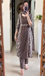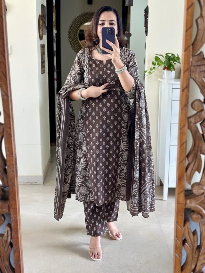 Step into timeless elegance with this Farida Gupta–inspired Mughal & Kalamkari Fusion Azrak Bagru Print kurti pant dupatta set.