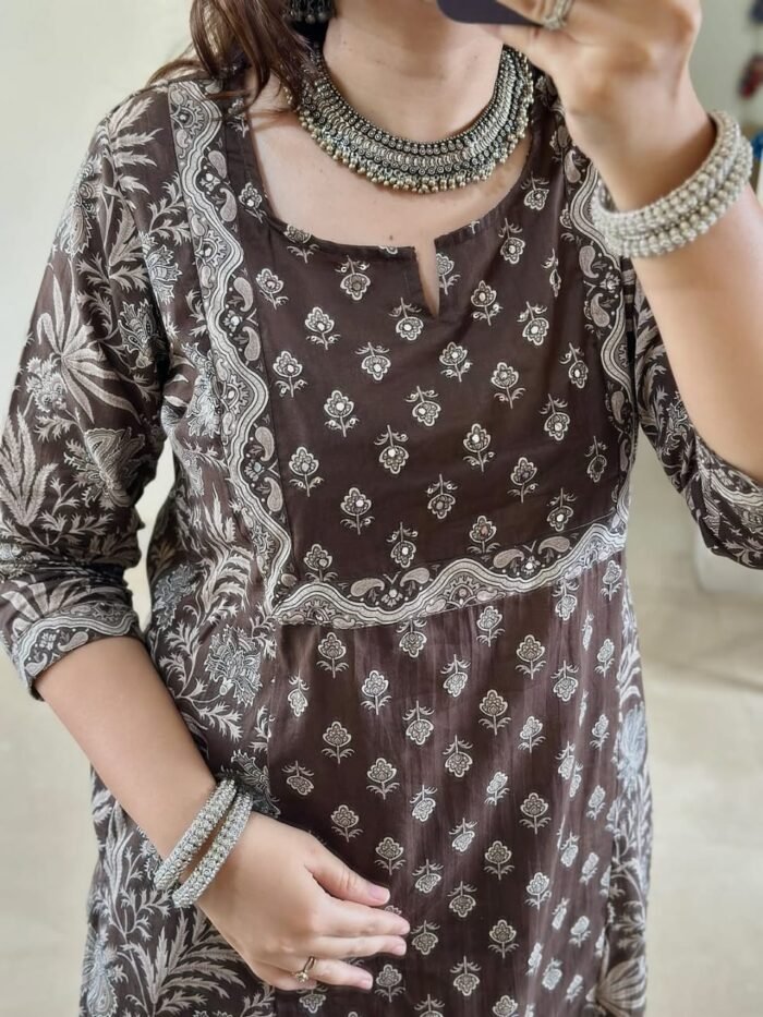 Crafted from premium fine cotton, featuring handcrafted adda, anchor, and patra work on the yoke, it’s a true boutique masterpiece.