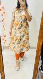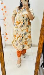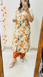 Step into effortless elegance with this Designer Coord Set, featuring an A-line kurti with side slit pattern paired with ankle-length pants in fine Paper Silk Cotton.
