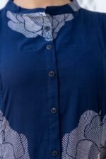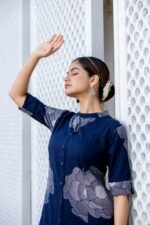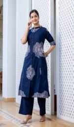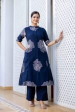 Step into effortless elegance with this Designer Coord Set, featuring an A-line kurti with side slit pattern paired with ankle-length pants in fine Paper Silk Cotton.