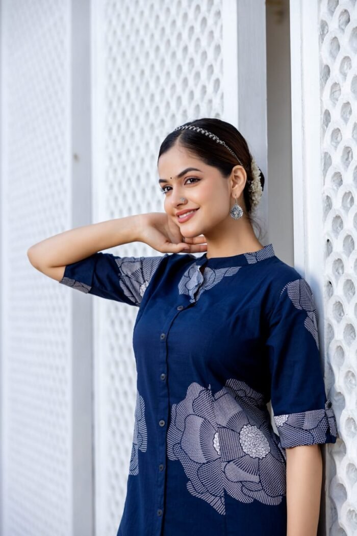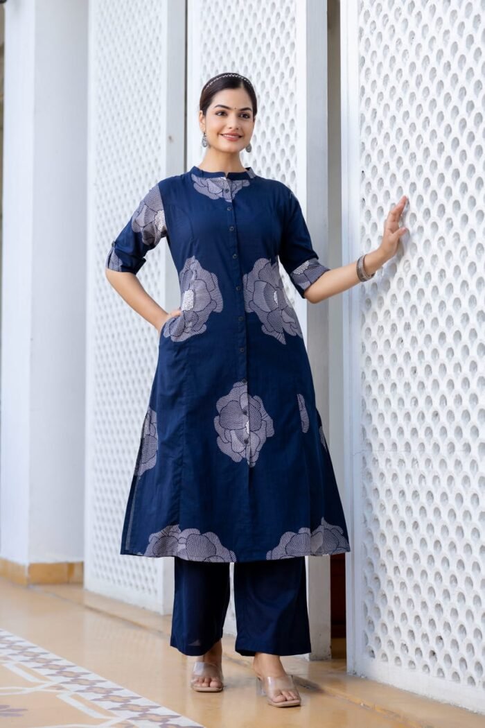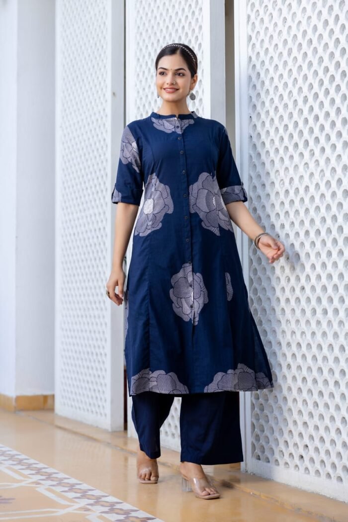 Step into effortless elegance with this Designer Coord Set, featuring an A-line kurti with side slit pattern paired with ankle-length pants in fine Paper Silk Cotton.