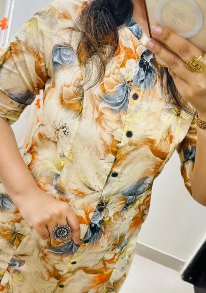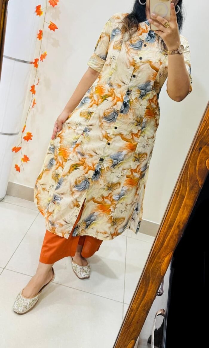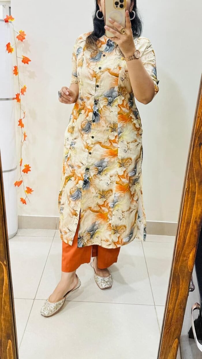 Step into effortless elegance with this Designer Coord Set, featuring an A-line kurti with side slit pattern paired with ankle-length pants in fine Paper Silk Cotton.