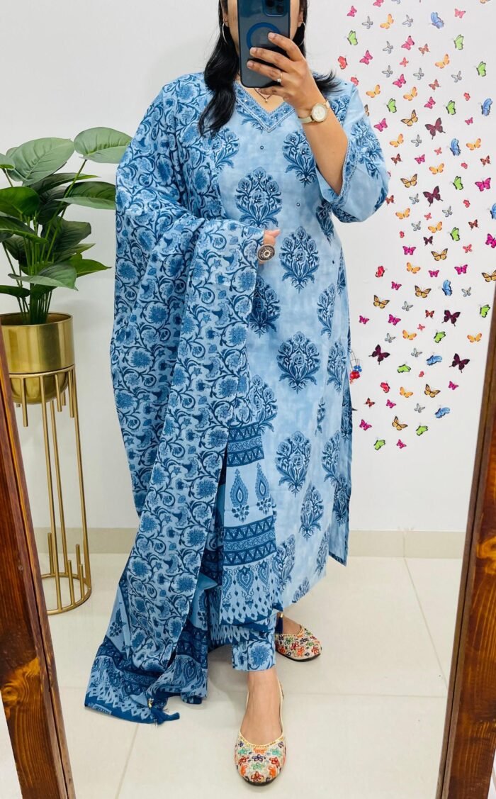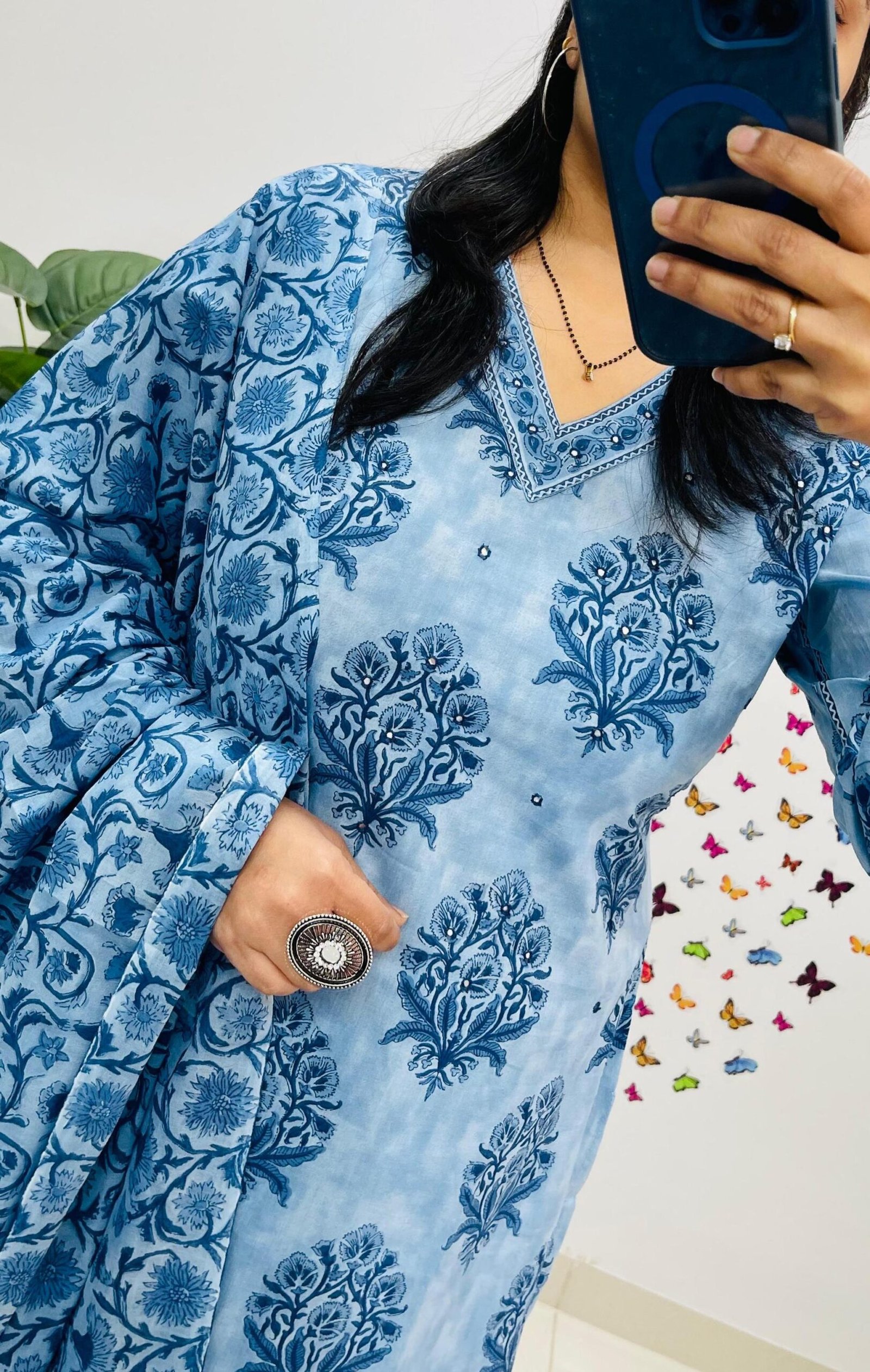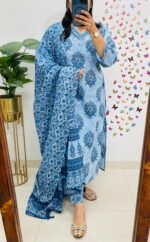 Step into elegance with this Mughal–Kalamkari Fusion Azrak Bagru Print Kurti Pant Dupatta Set — crafted in Premium Fine Cotton and adorned with handcrafted detailing on the yoke. Paired with a soft cotton dupatta, this outfit exudes class and charm for every occasion! 🌸✨