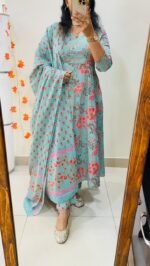 Made from premium fine cotton fabric, it features a Jaipuri floral Idaho print, badla adda embroidery on the yoke, and fashion tassels on the sides, giving a gorgeous and eye-catching look.