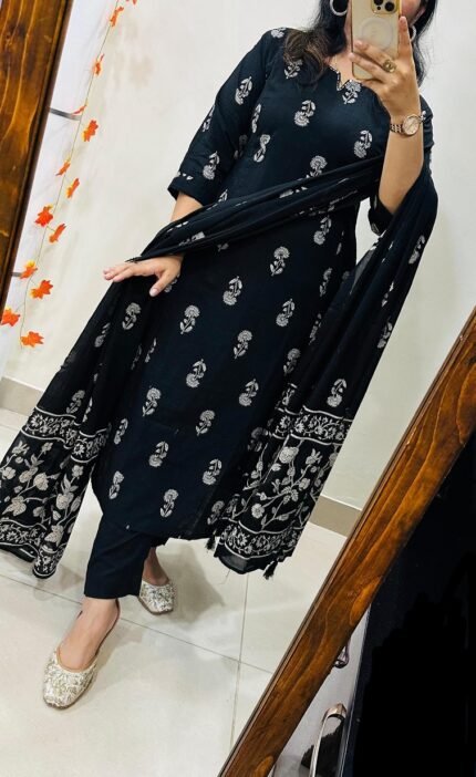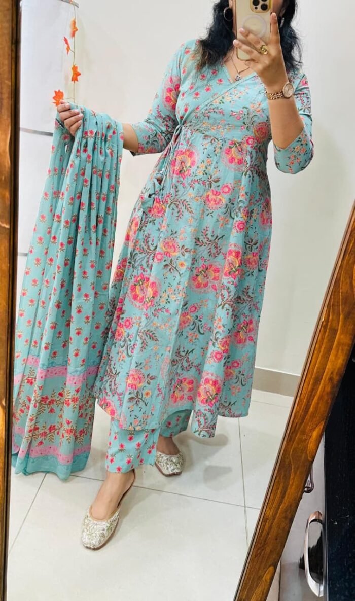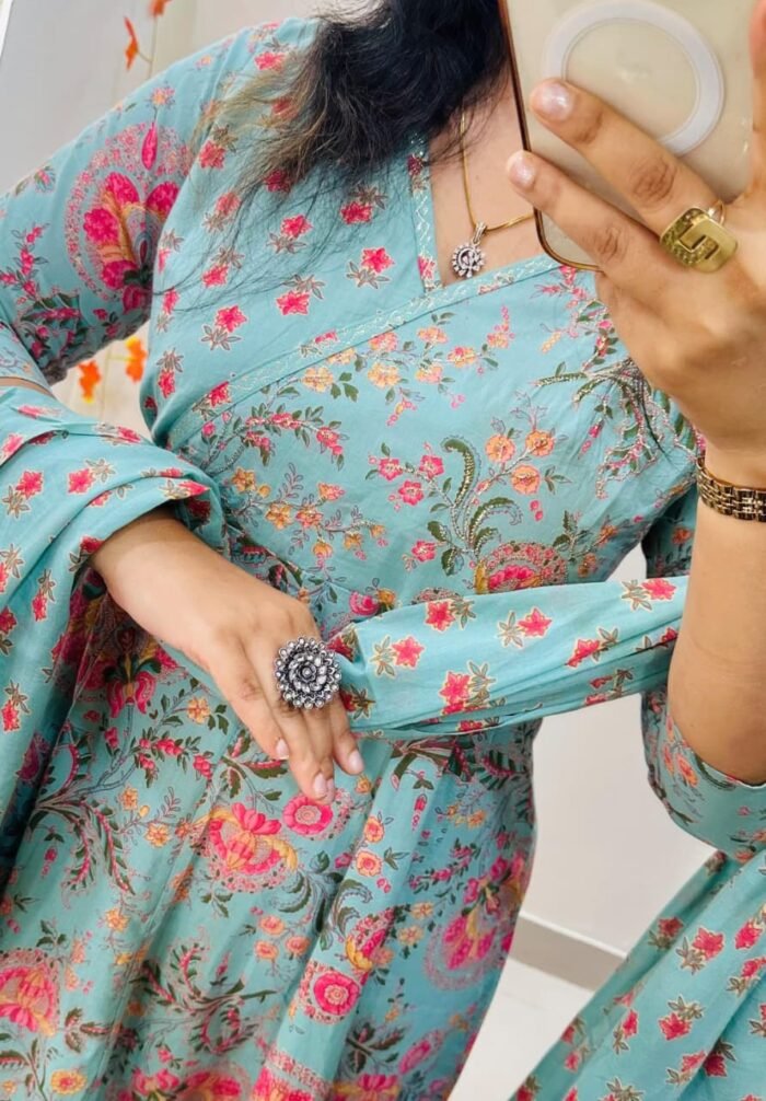 Made from premium fine cotton fabric, it features a Jaipuri floral Idaho print, badla adda embroidery on the yoke, and fashion tassels on the sides, giving a gorgeous and eye-catching look.