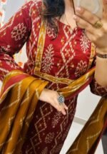 Add a touch of royalty to your wardrobe with this exquisite Kurti Pant Dupatta Set, crafted in premium fine Azrak Cotton.
