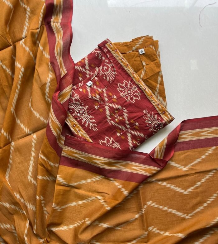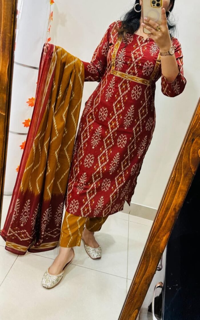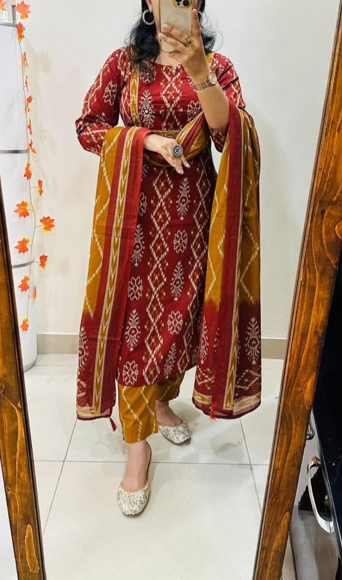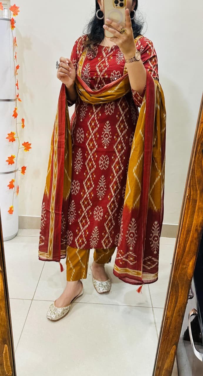 Add a touch of royalty to your wardrobe with this exquisite Kurti Pant Dupatta Set, crafted in premium fine Azrak Cotton.