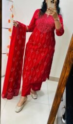 Step into elegance with this Kurti Pant Dupatta Set, crafted from premium fine cotton.