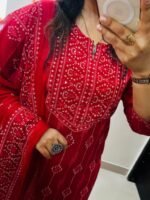 The kurti features sequin work on the yoke, paired with a fine cotton dupatta for a charming and graceful look.