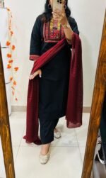 The kurti features heavy thread embroidery with original mirror and applique work on the yoke and sleeves, adding a mesmerizing charm.