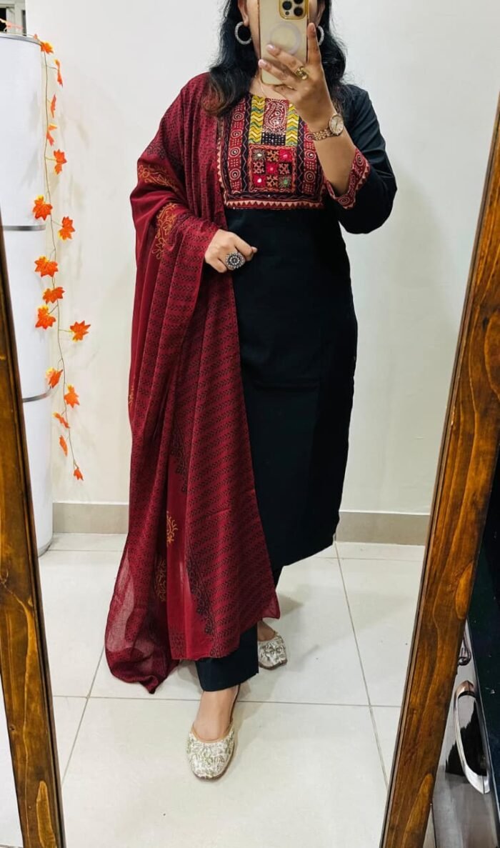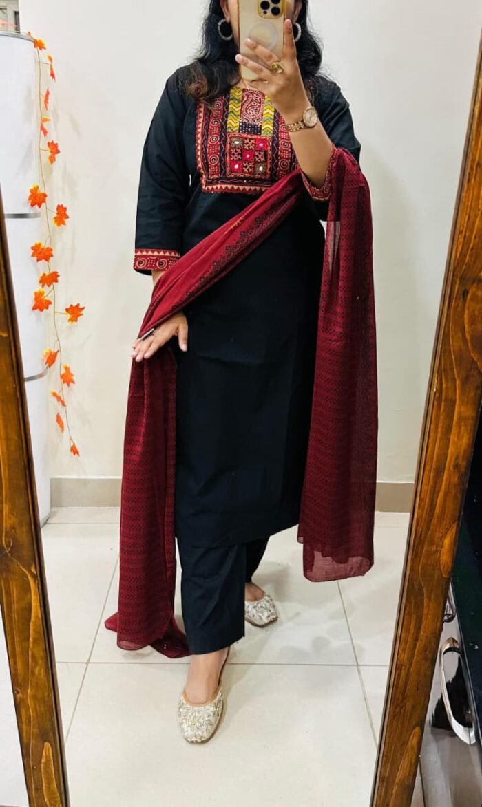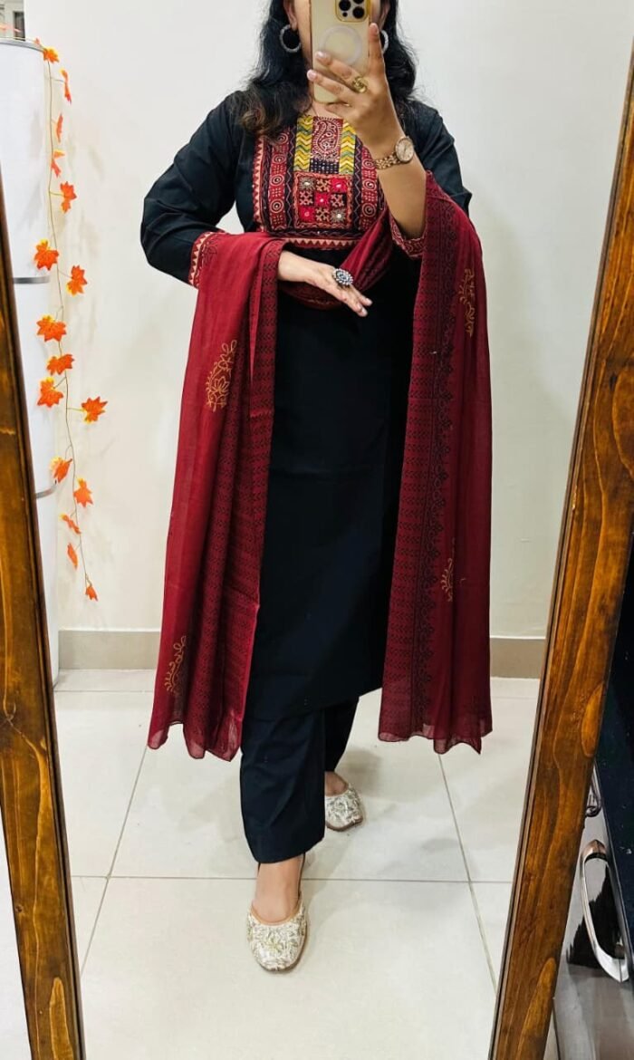 Celebrate elegance with this beautiful Kurti Pant Dupatta Set, crafted from premium fine Dhabu Cotton.