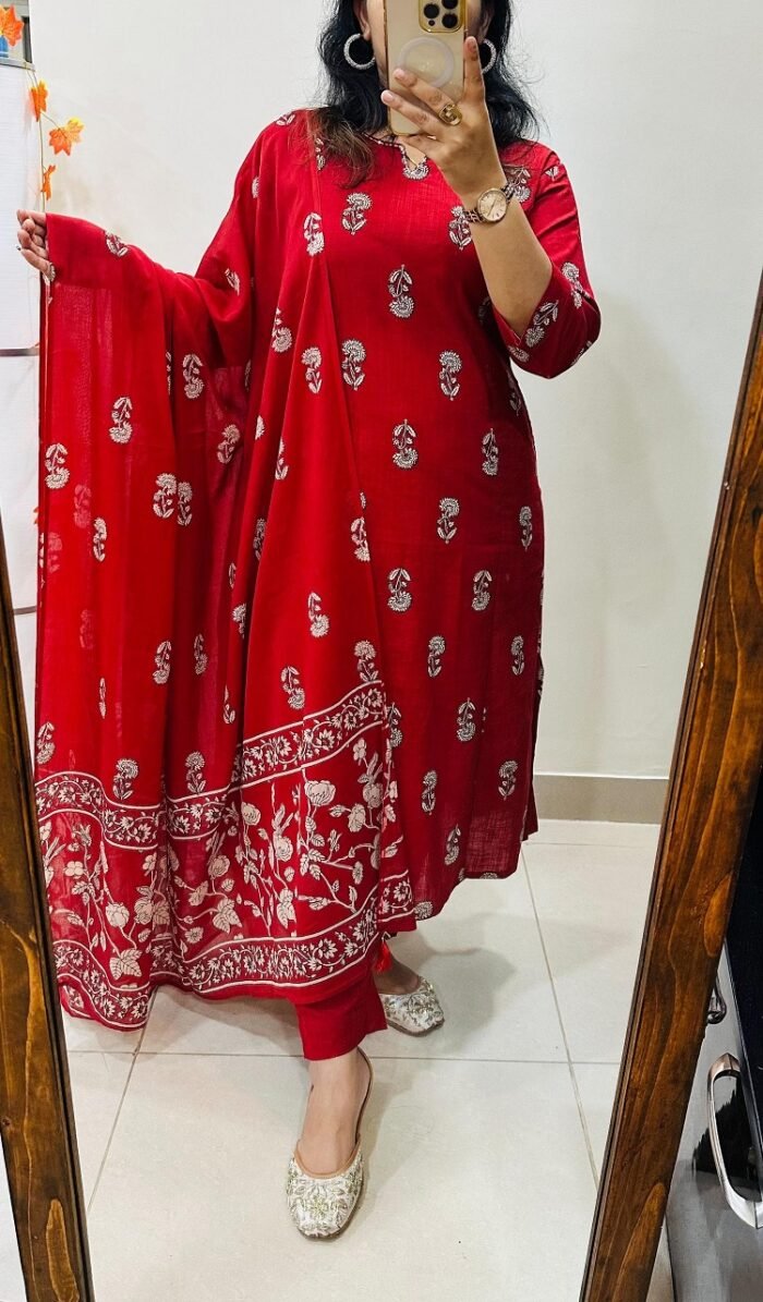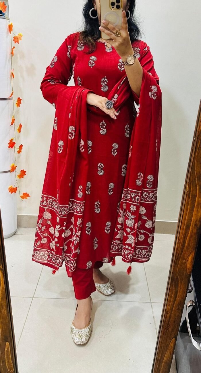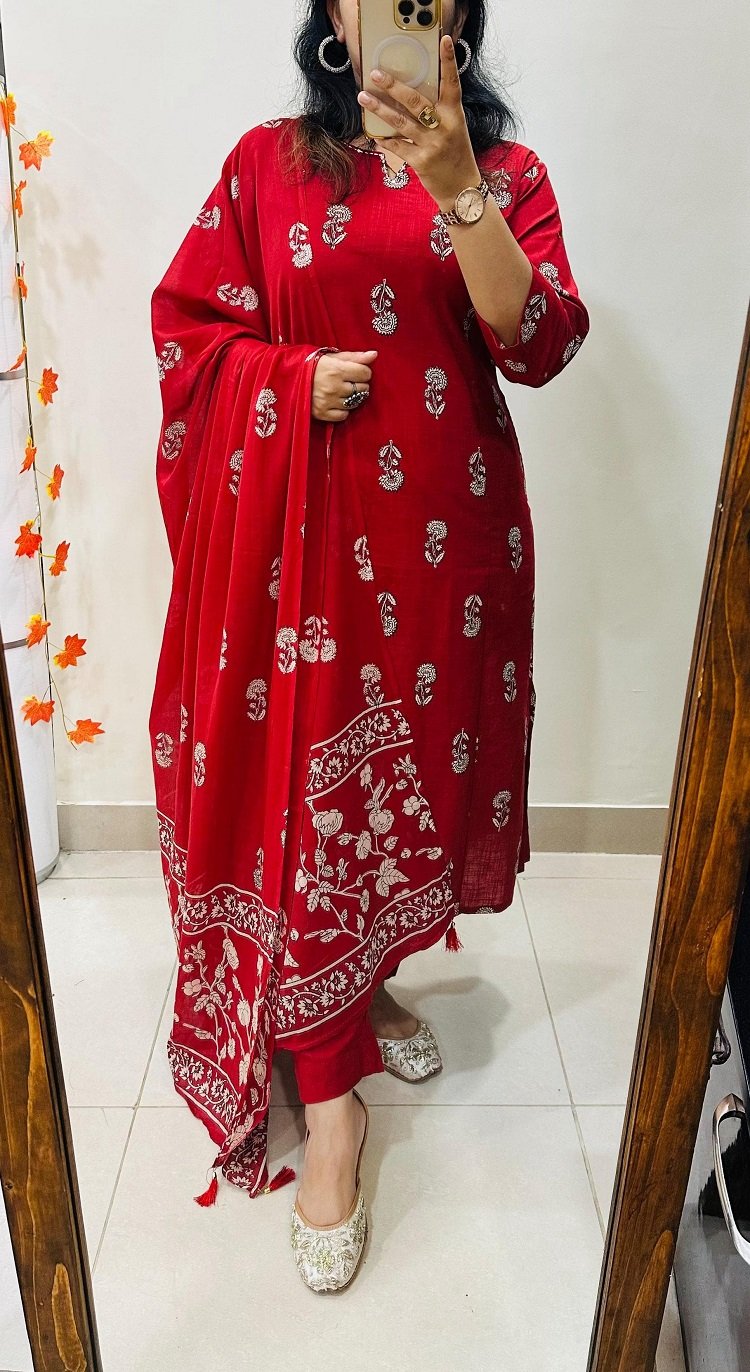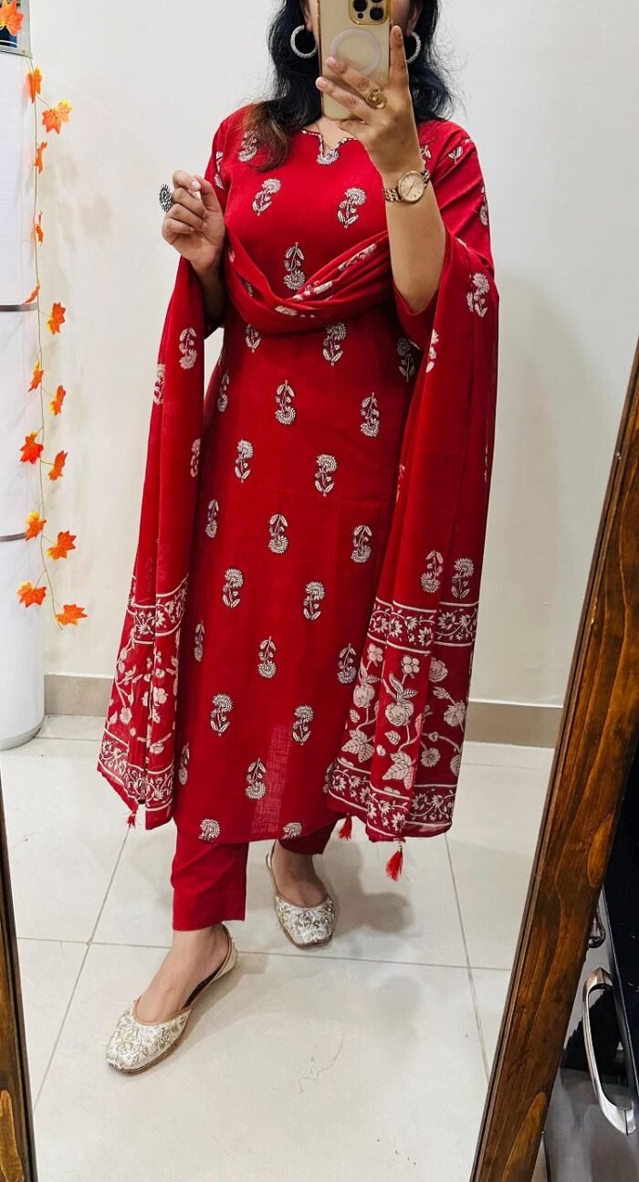 Add a touch of sparkle to your wardrobe with this stunning Kurti Pant Dupatta Set, made from premium rich cotton.