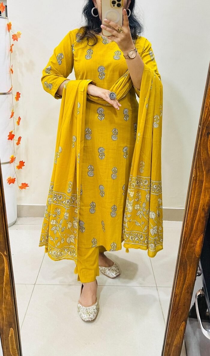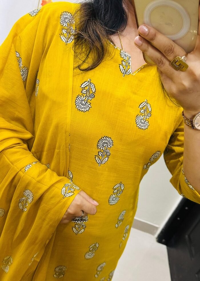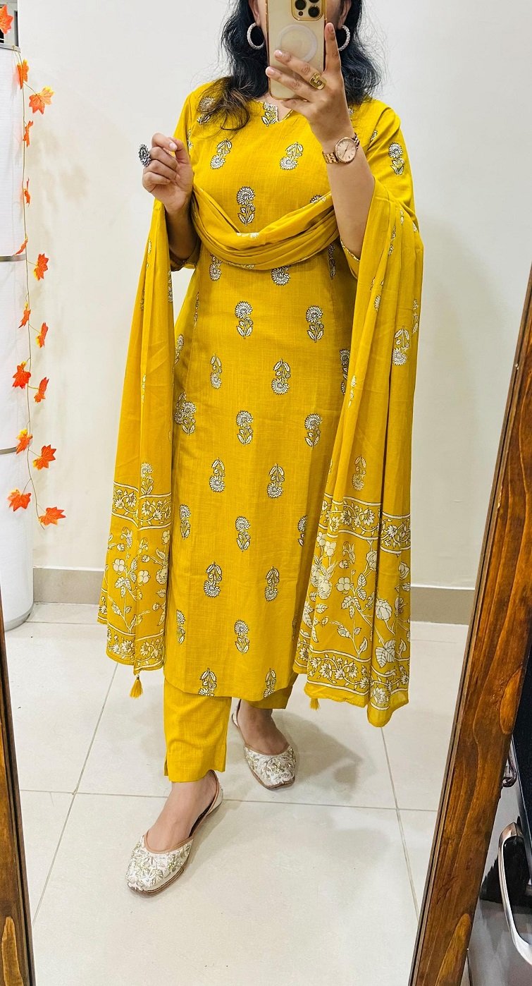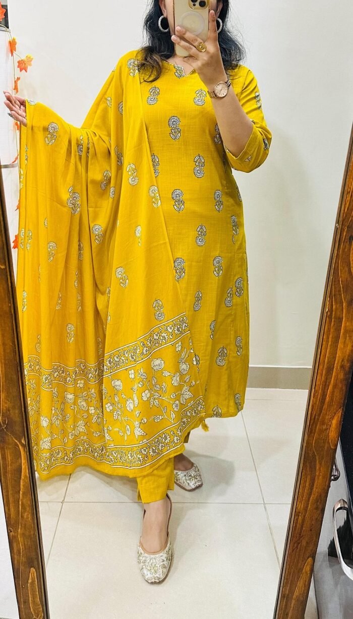 Elevate your ethnic style with this beautiful Kurti Pant Dupatta Set, crafted in premium rich cotton.
